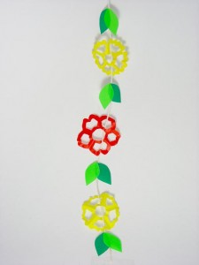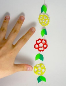 Combine as many colours as you like and make several strings of flowers. Once you have a few strings, you can make fun mobiles, window or wall hangings, or even a curtain of strung flowers.
